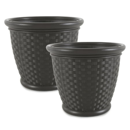 The package includes 2 Suncast Sonora 18-Inch Resin Wicker Planters for the perfect addition to your yard. Built strong with plastic, this planter is meant to last. Its lightweight design is easy to maneuver around, so you can have the ideal location for y...
