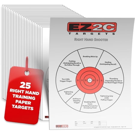 Elevate your shooting practice with these 25 EZ2C Right Hand Shooter Diagnostic Training Paper Targets. Featuring a 10-inch target with four scoring rings, these high-quality 11"x17" bright white paper targets are printed with easy-to-see red ink for enhan...