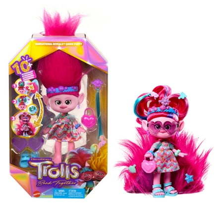 Inspired by popular DreamWorks Trolls Band Together characters, Hairsational Reveals fashion dolls let kids create unlimited hairstyles with not one, but two kinds of hair! Queen Poppy fashion doll has both furry, plush, removable hair and soft, attached h...