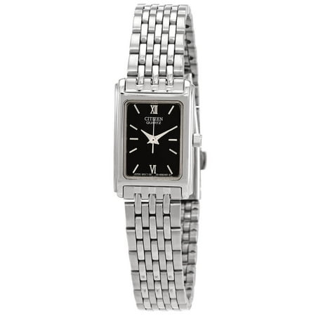 Citizen Quartz Black Dial Ladies Watch EJ5850-57E CZEJ5850-57E Description Black dial enhanced by silver-tone hands. Silver-tone stainless steel case with a silver-tone stainless steel band. Quartz movement. 50 meters / 165 feet water resistance. Fixed bez...