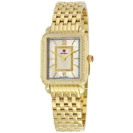 Gold-plated stainless steel case with and bracelet. Fixed gold-plated bezel set with diamonds. Mother of pearl diamond-set dial with gold-tone hands and index hour markers. Roman numerals mark the 6 and 12 o'clock positions. Minute markers around the outer...