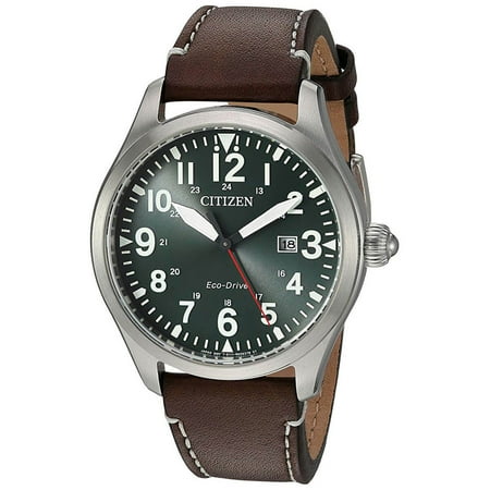 Green dial enhanced by luminous silver-tone hands. Silver-tone stainless steel case with a dark brown leather band. Eco-Drive movement. 100 meters / 330 feet water resistance. Fixed bezel. Scratch Resistant Mineral crystal. Solid caseback. Tang clasp. Case...