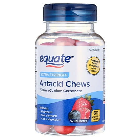 Get fast relief with Equate Extra Strength Antacid Chews. Made with calcium carbonate, they help provide relief from acid indigestion, sour stomach, and heartburn. These calcium carbonate chews have a wild berry flavor that makes them easy to get down. Eac...