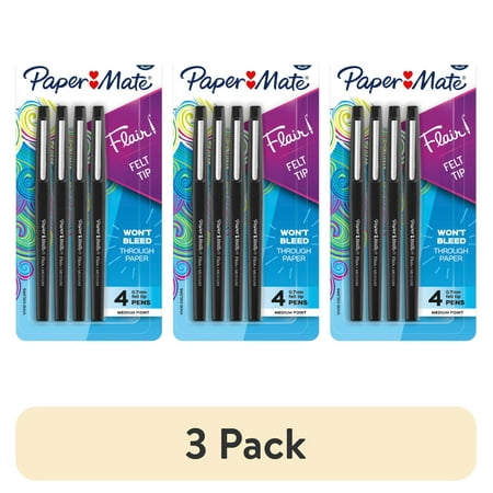 Paper Mate Flair, Black Medium Point, Pack of 4 pens features a plastic collar that helps prevent the tip from fraying. These Paper Mate Flair pens are made to provide long-lasting use. The felt tip lets you create clear, bold lines that are easy to see an...