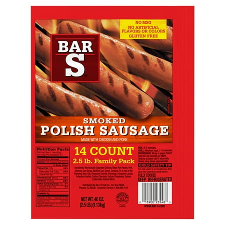 Bar S Smoked Polish Sausage comes in a 40 oz family pack, featuring 14 fully cooked sausages made from a blend of chicken and pork. This 2.5 lb pack is gluten free, with no MSG, artificial flavors, or colors. Inspected for wholesomeness by the USDA, these ...