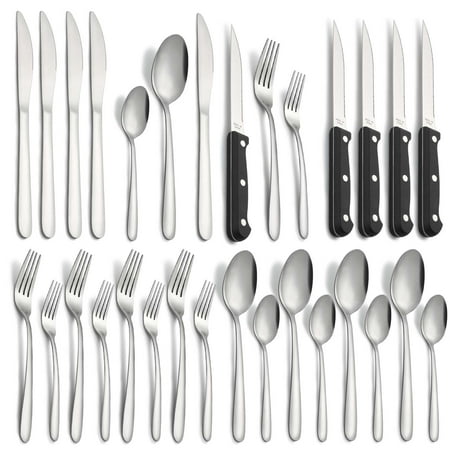 Bestdin 24 pieces silverware set is ideal for 4 persons, which includes dinner fork, dessert fork, dinner knife, steak knife, dinner spoon and tea spoon. The cutlery set is made of high quality stainless steel that ensures safety and durability. The silver...