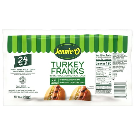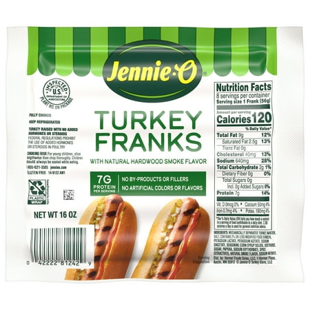 JENNIE-O Turkey Franks have *40% less fat than USDA data for beef franks.* With natural smoke flavoring, you'd be hard pressed to realize you're eating a turkey frank over a traditional beef hotdog. JENNIE-O Turkey Franks have 120 calories and 7 grams of p...