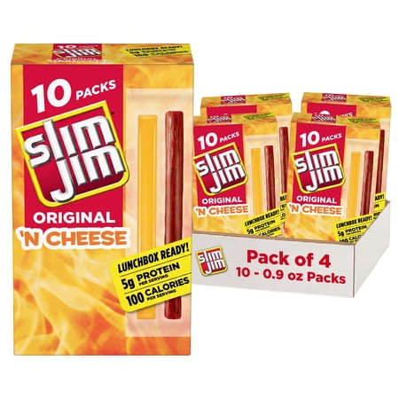 Experience a powerful snack combo with delicious Slim Jim Original 'N Cheddar Smoked Snack Sticks. Made with beef, pork and chicken and real cheddar cheese, these cheese and meat sticks contain no artificial flavors or colors for full meaty flavor everyone...