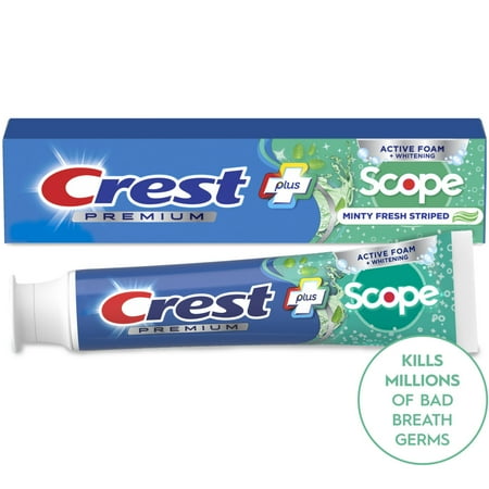 Crest Premium Plus Scope Minty Fresh toothpaste kills millions of bad breath germs and leaves breath minty giving you the ultimate combination of a clean and fresh smile. The Crest Premium Plus line features an Active Foam plus Whitening formula that remov...