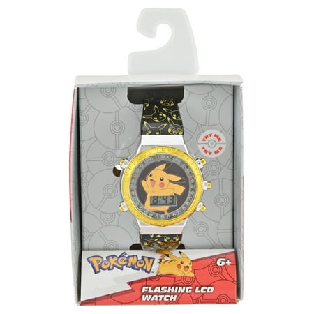 The Pokémon Pikachu Unisex Child Yellow and Black LCD Flashing Bezel Watch (Model #POK4258WM) combines playful design with practical timekeeping for young fans. The silver case features a metallic yellow bezel with rotating lights, making the LCD display ...