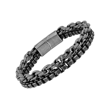 Do you want that stacked bracelet look without worrying how to pick pieces that go together? Check out this stainless steel two strand bracelet in captivating gunmetal tone. Compact and uniform box links are popular for their simplicity, while a thick twis...