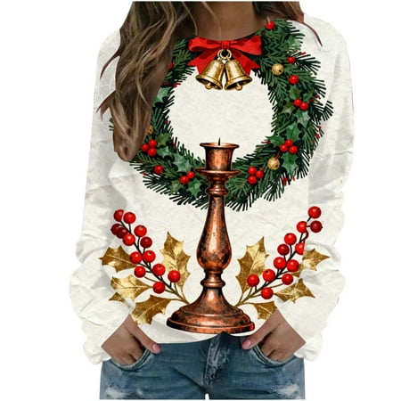 Festival Saving Fall Fashion Must Haves Womens Round Neck Glitter Christmas Pullover Sweatshirt Long Sleeve Holiday Top Women Fall Clothes My Items 🎄christmas tops,christmas top,christmas tops for women,christmas tops women,christmas tops plus size,chri...
