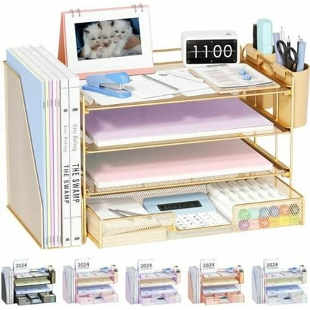 đăMulti-Functional Office OrganizationăGet your work area in order with the Desk Organizer! Featuring 4 spacious trays, a vertical file organizer, 2 convenient hanging pen holders, and a sliding drawer, you can store all your office supplies, classi...