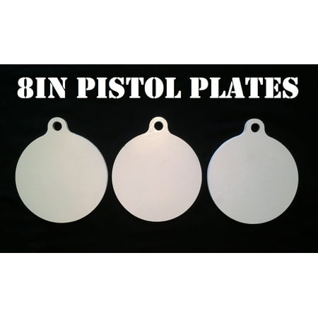 Set includes three 8 inch diameter round steel shooting plates with a 5/8in. holes for hanging or mounting. These steel targets are great for small-bore rifle and most pistol shooting, including 22 rim-fire, 9mm, 45ACP as well as many other pistol calibers...