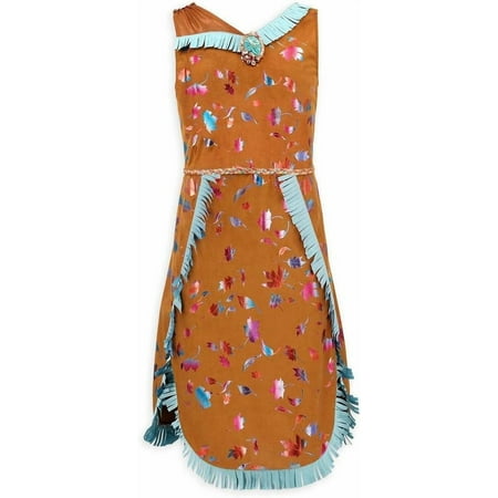Explore the colors of the wind in our Pocahontas Classic costume. Dress features an asymmetrical neck and hemline, character cameo, wide fringe hem and uncrushed panne fabric gives that suede look and feel.