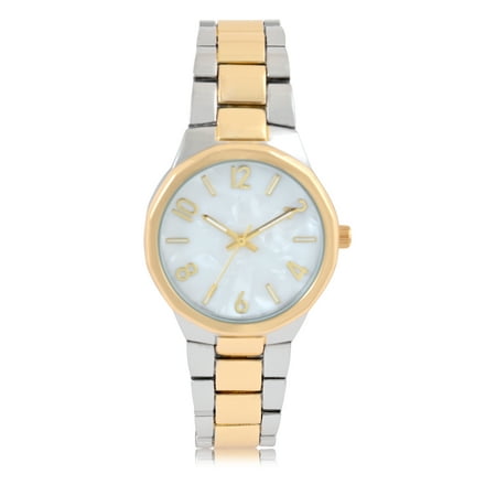 Ladies Two Tone Classic 33 MM Round Case Watch With Easy Adjustable Bracelet and Mother Of Pearl Dial.